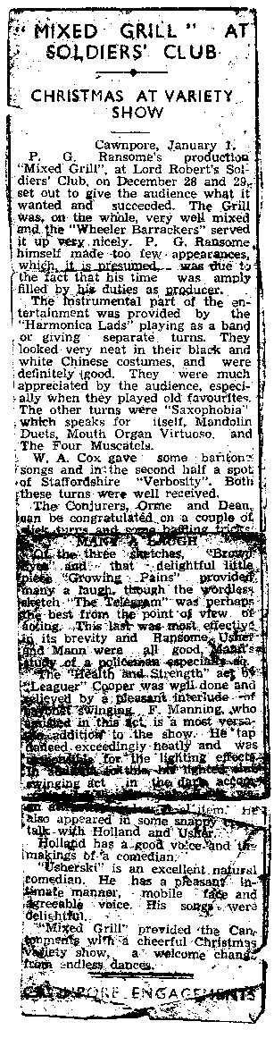 A NEWSPAPER CUTTING FROM CAWNPORE WITH A REVIEW OF A CHRISTMAS AMATEUR THEATRICAL SHOW WHICH MY DAD APPEARED IN