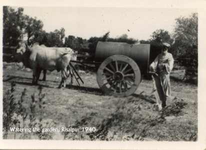 Bullock cart fitted with water tank and used to water gardens in Risalpur 1940