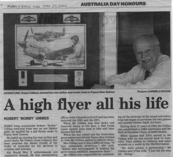 | One of our special customers Wing Commander ( RTD ) Bobby Gibbes DSO DFC & BAR . He has done many things in his long life, from jackaroo to WW 2 fighter ace then aviation pioneer, coffee planter and hotelier in Papua New Guinea. After "retiring" he sailed his catamaran Billabong solo from Egypt to Singapore, built and flew his own light aircraft, wrote and published his autobiography and has now been awarded the OAM for services to aviation and tourism in the 2004 Honours list |
