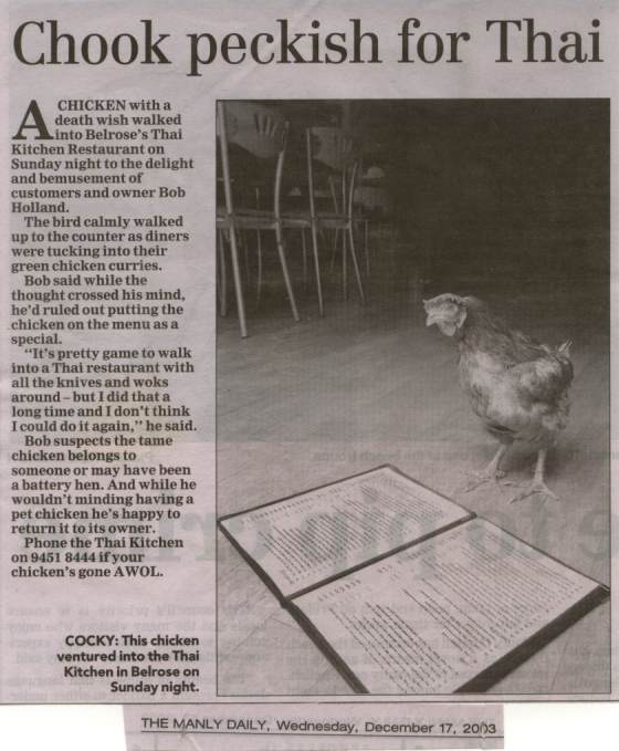 This is a hen that walked in the resturant just after we opened in December 2003, no owners turned up to collect her so we gave it to nice lady in Terrey Hills who has promised to look after her.