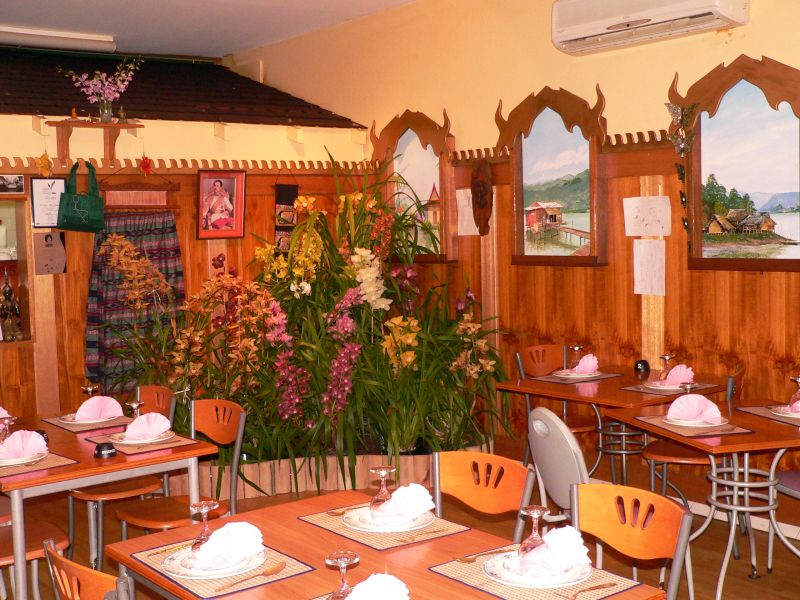 | Rampai's hobby is growing cymbidium orchids. This year they all flowered early and at the same time so rather than leave them at home in the garden where we would hardly get to see them we brought them all upto the restaurant and set up this display where we can see them all day and share them with the patrons. |